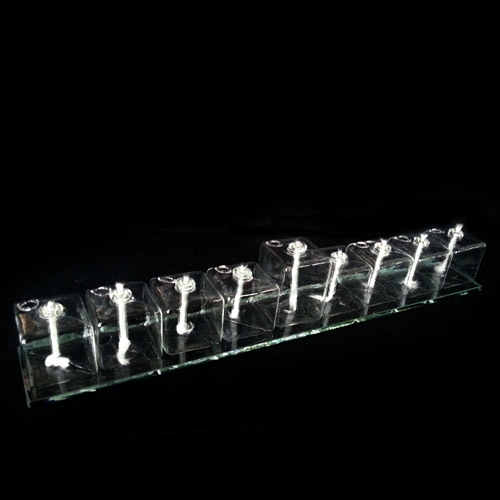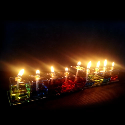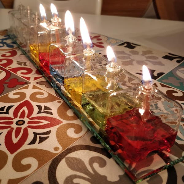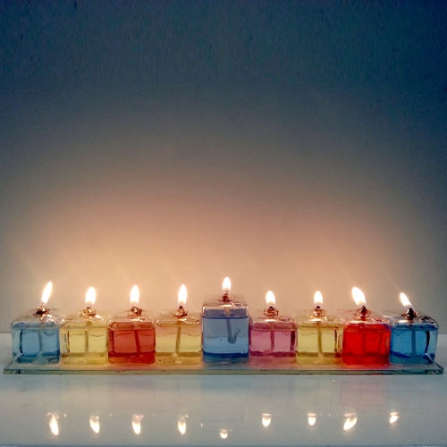 חנוכיית שמן מרהיבה ביופיה, עשויה זכוכית, למילוי בשמן פראפין מיוחד וצבעוני.