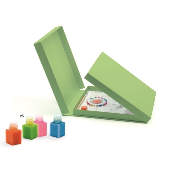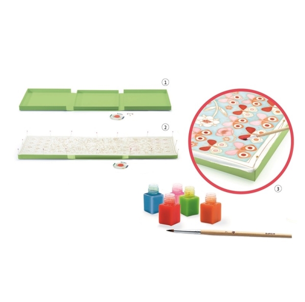 הקופסה משמשת להחזקת הצעיף, קווי המתאר של הציור, מונעים מהצבע לגלוש ובכך מבטיחים תוצאת מושלמת.