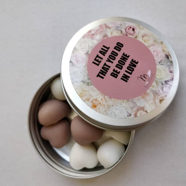 Let All That You Do Be Done In Love  – קופסת פח מעוצבת ומלאה בלבבות סבון בניחוח אביבי.