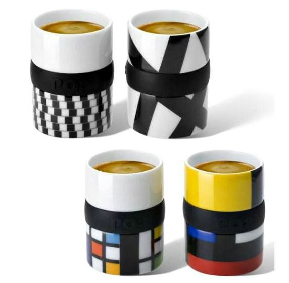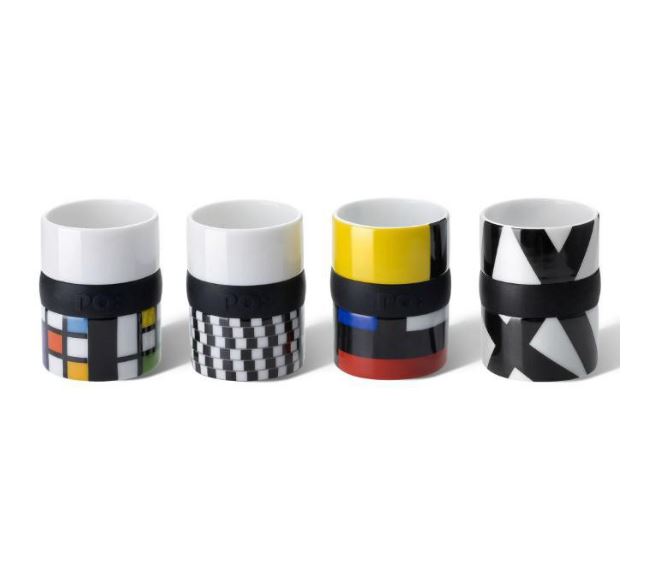 סט מעוצב של 4 ספלי אספרסו , המעוטרים בהשראת יצירתו של הצייר ההולנדי פיט מונדריאן.
