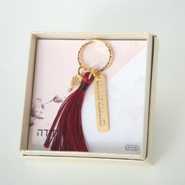 מחזיק מפתחות מעוצב עם מסר, בתוספת גדיל צבעוני.