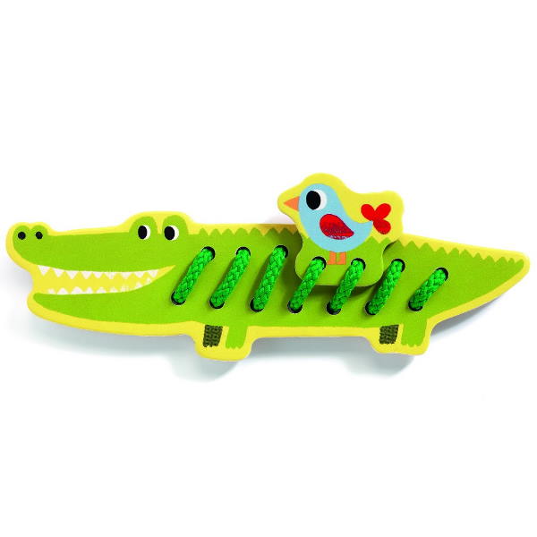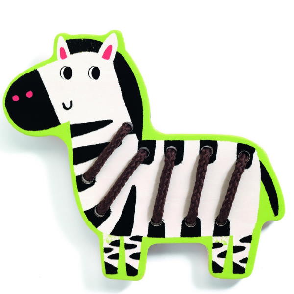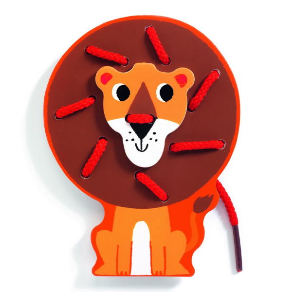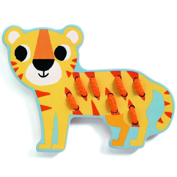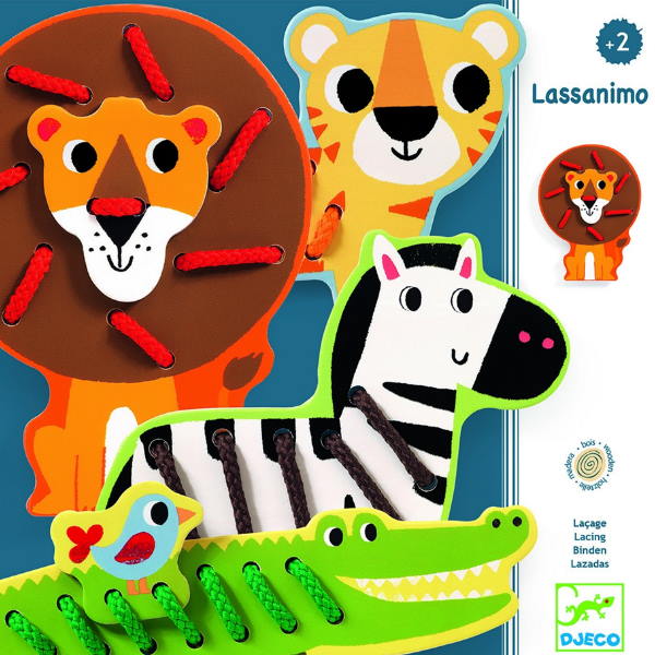 משחק השחלה של חוט ליצירת משפחת חיות צבעוניות.