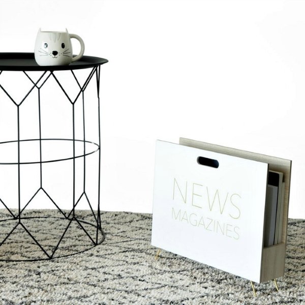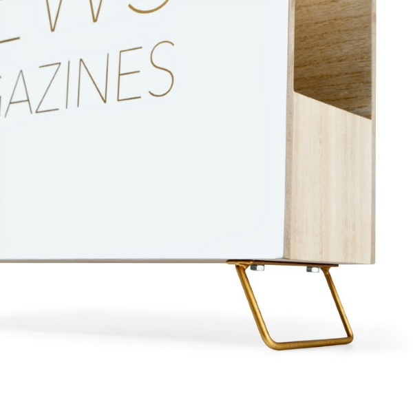 מעמד עץ לעיתונים ומגזינים, בשילוב רגלי מתכת מוזהבות,