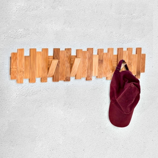 מתלה  במראה של גדר עשוי פיסות עץ.