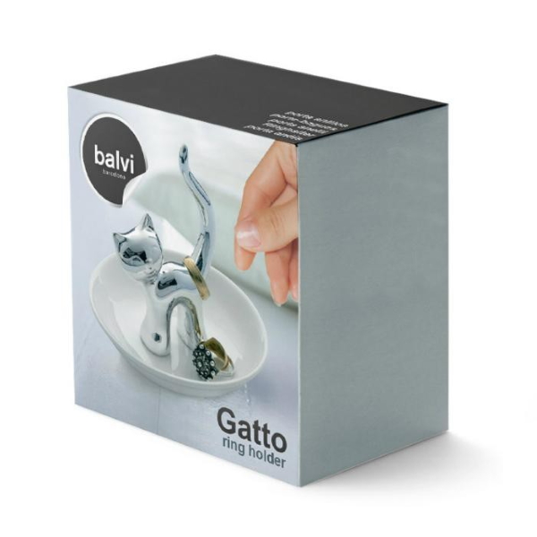 צלוחית פורצלן קטנה עם חתול כסוף עליה לאחסון תכשיטים קטנים.