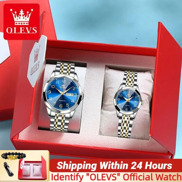 שעון זוגי מקורי חדש של OLEVS לגברים ונשים עם מראה רומבואיד, עמיד למים, מפלדת אל-חלד מוצקה, סט שעונים לאהובים, מתנה