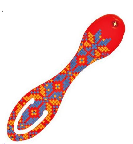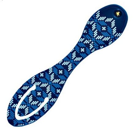 מנורת קריאה גמישה ודקיקה, מעוטרת בגרפיקה צבעונית ומדליקה.