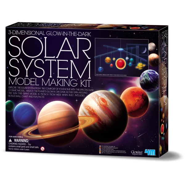 בקופסה:ערכה להרכבה של כוכבי לכת של מערכת שמש מפלסטיק, מתלה וחוטים, 2 רצועות צבע, 2 צבעים זוהרים, 2 מברשות צבע, גליל של חוט דק לתלייה.