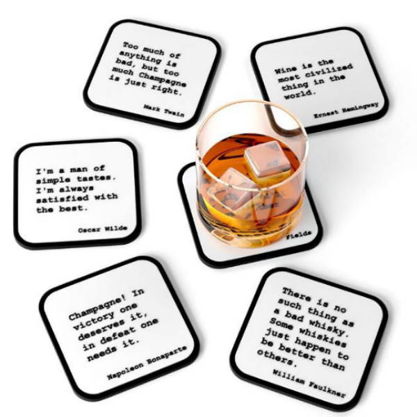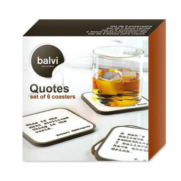 הסט כולל שש תחתיות כוסות בגווני מונוכרום, המציגות ציטוטים שנאמרו ע"י מפורסמי עולם על המשקאות שהם אוהבים.