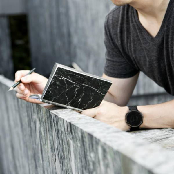 קצוות המחברת העבה צבועים בהתאמה מושלמת עם הכריכה וכך נוצרת אשליה משכנעת כאילו מדובר בלוח שיש אמיתי.