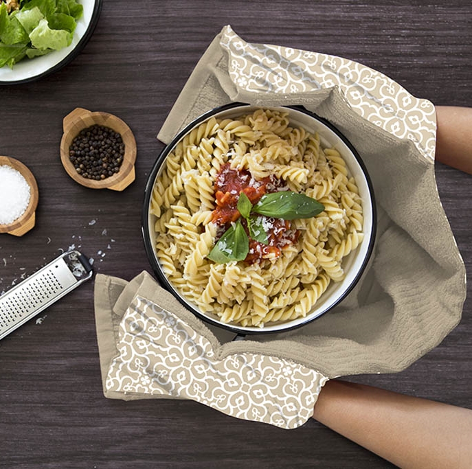 SMART TOWEL המגבת עם הכיסים, המשמשת גם לניגוב ידיים גם כתחתית לכלים חמים וגם ככפפה להחזקת כלים חמים.