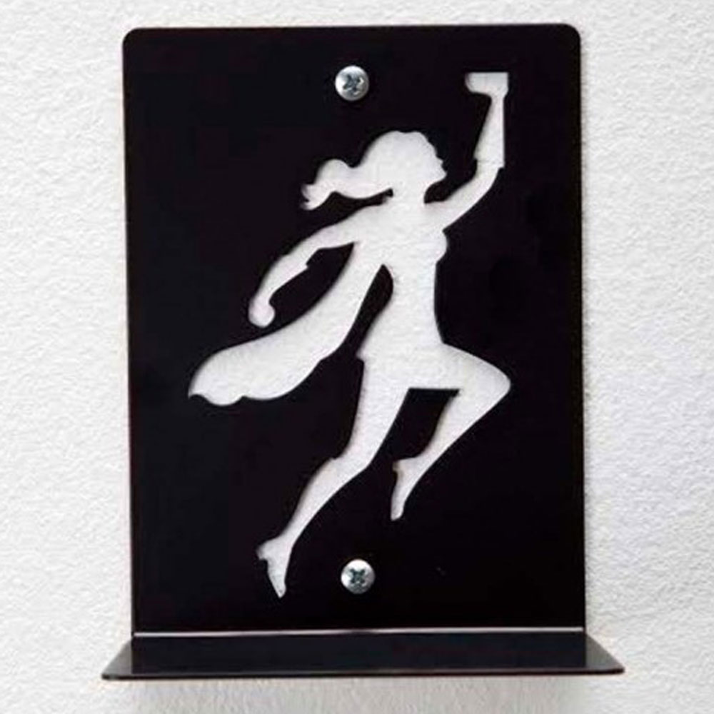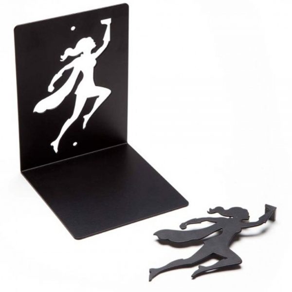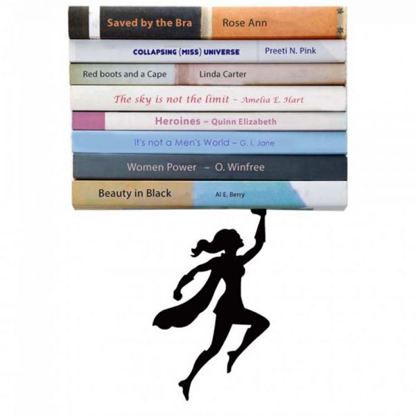 מדף ספרים מעוצב באופן מיוחד שנותן הרגשה כאילו הספרים מרחפים באוויר והגיבור הסופר-הירו בקלות ובגבורה מחזיק את הספרים מליפול.
